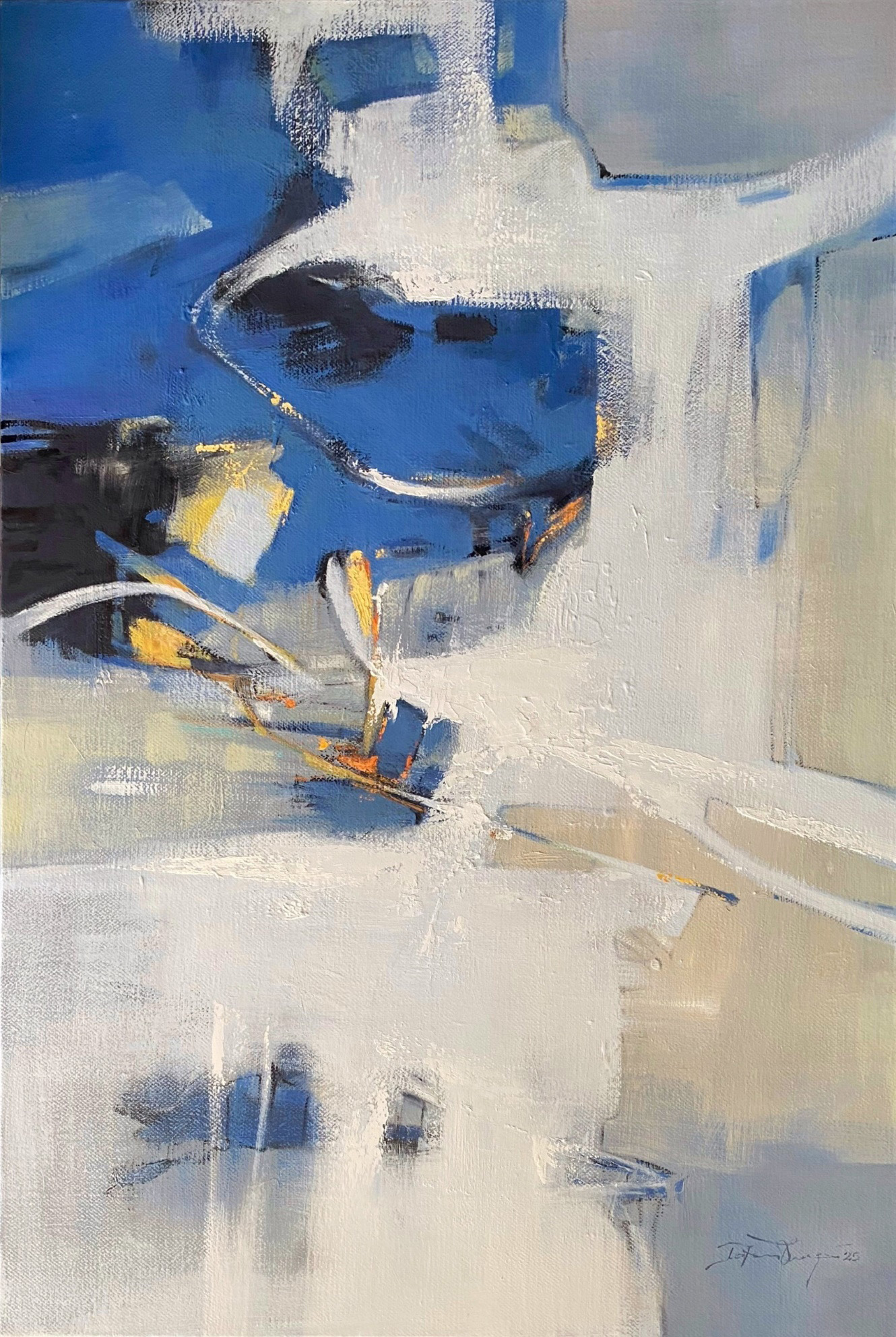 Màu xanh lam là gam màu chủ đạo, vừa gợi sự thẳm sâu của đại dương, vừa gợi bầu trời vô tận. Xanh ở đây không khép kín, mà hòa cùng những mảng trắng rộng lớn, tạo cảm giác sáng trong, nhẹ nhõm. Các khoảng trắng được xử lý như hơi thở của gió, vừa là khoảng lặng, vừa mở ra độ rộng mênh mang cho toàn bộ bố cục. Xen vào đó, những điểm vàng và cam nhỏ bé, dù xuất hiện ít, lại có sức gợi mạnh mẽ: chúng như nốt nhạc thắp sáng, làm cho bản hòa tấu trở nên sinh động, tránh rơi vào tĩnh mịch tuyệt đối.