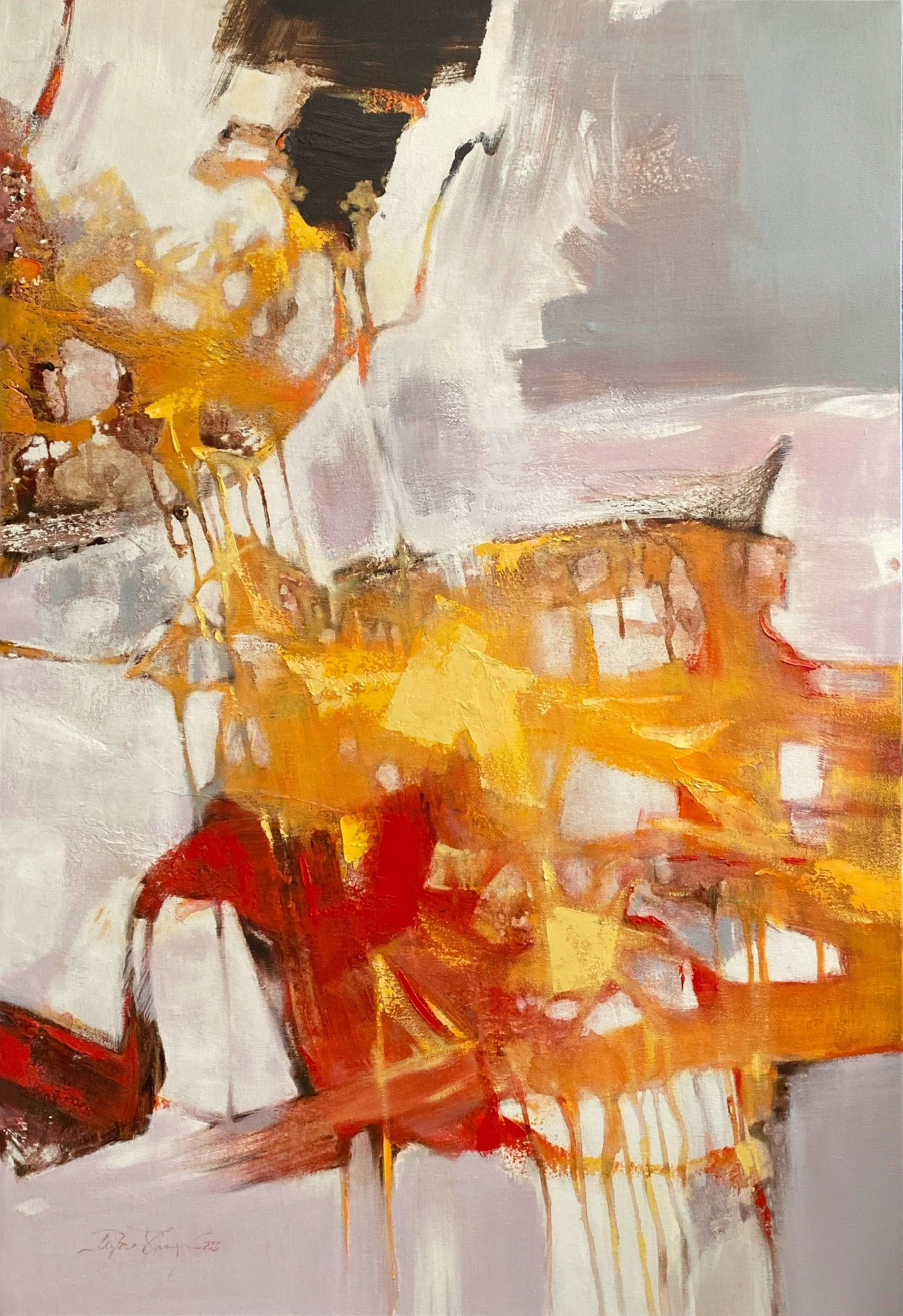 Màu sắc là yếu tố trung tâm: vàng – cam – đỏ không chỉ gợi dậy ánh sáng của mặt trời mà còn khơi gợi nguồn năng lượng sống dồi dào, niềm tin và sự tái sinh. Trên nền xám – trắng mờ ảo, sắc vàng trở nên nổi bật, như khúc ca vượt lên khỏi tĩnh lặng, soi chiếu vào không gian và mở ra một trường tưởng tượng vô tận. Sự đối lập giữa mảng tối nâu – đen và ánh vàng rực rỡ làm tác phẩm vừa có kịch tính, vừa có chất thơ.