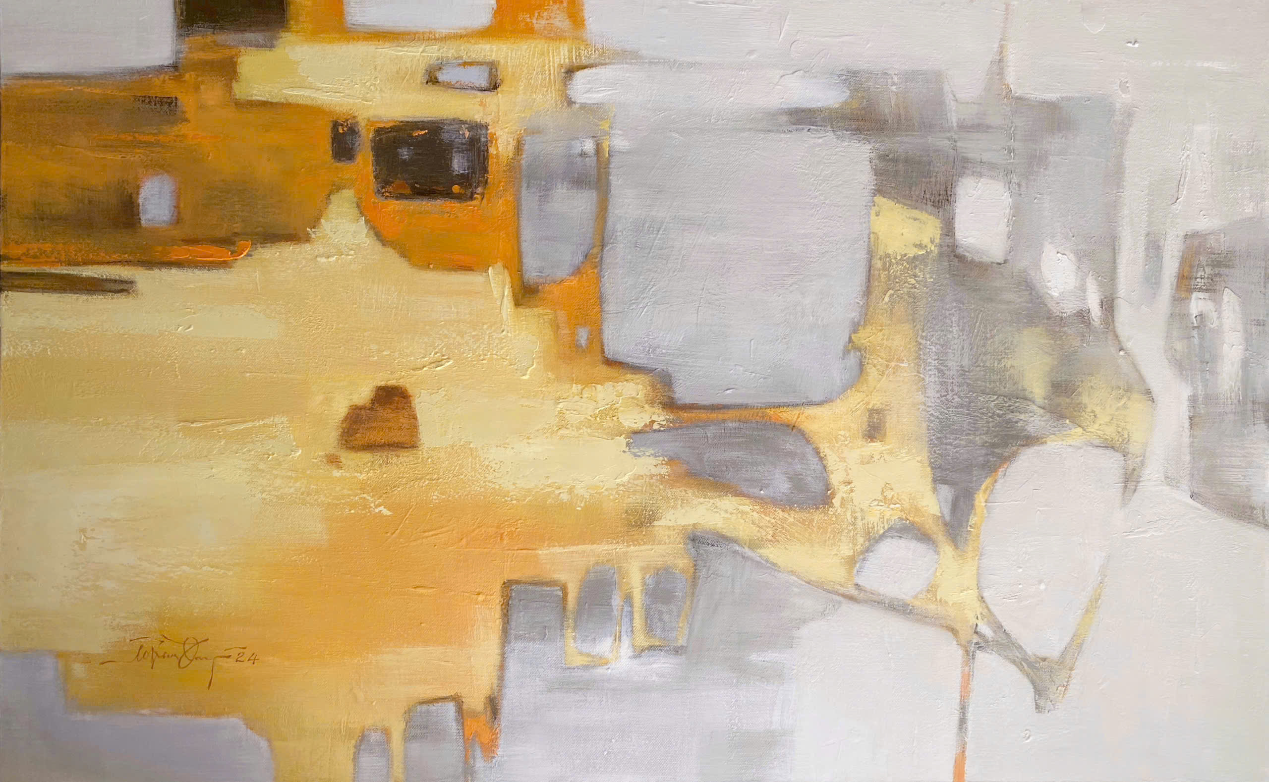 Bố cục tranh được xử lý uyển chuyển, các mảng đậm nhạt xen kẽ nhau không đối xứng nhưng cân bằng trong tổng thể. Ở giữa bức tranh, sắc vàng nhạt lan tỏa như trung tâm của một dòng chảy, kéo ánh nhìn người xem đi về hai phía – như dòng thời gian cuốn trôi, như mùa đang chở con người đi qua những miền ký ức và biến chuyển của tâm hồn.